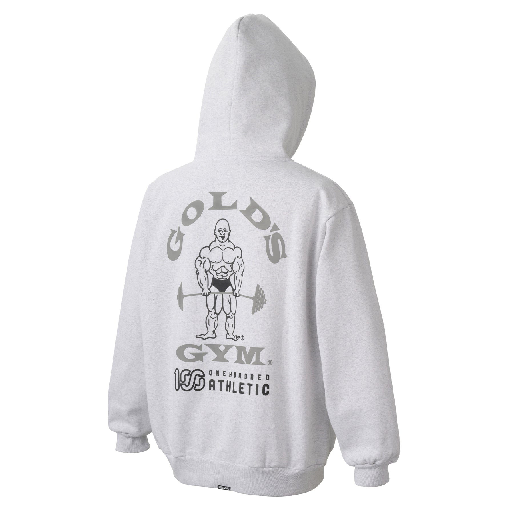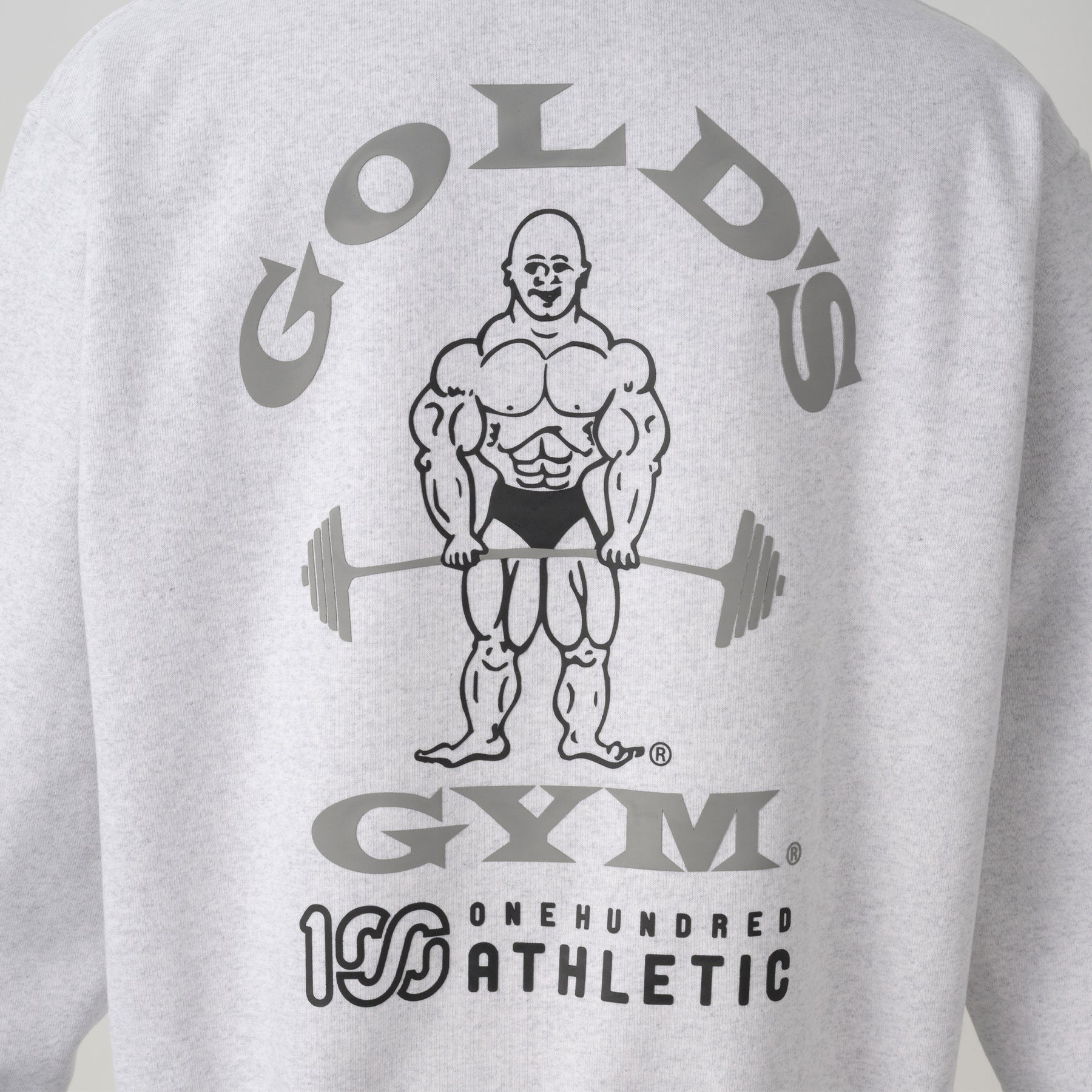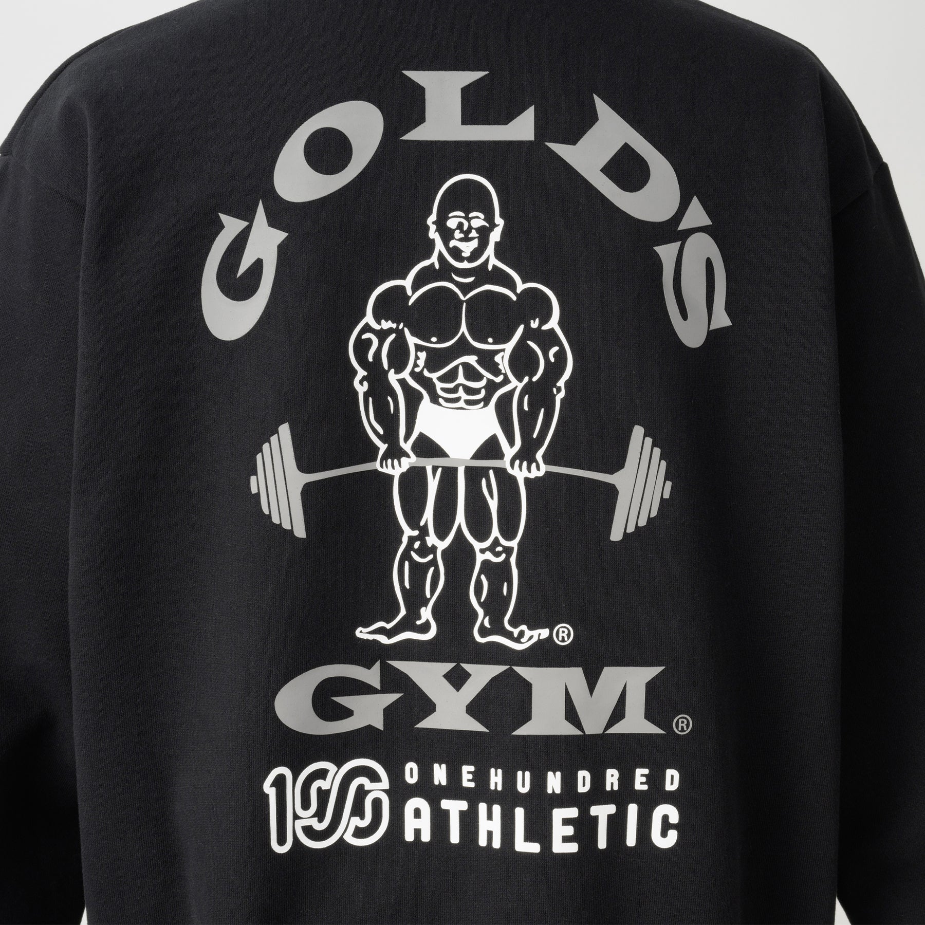 フロントにはGOLD'S GYM と100A のロゴを組み合わせたコラボレーションロゴを、バックにはGOLD'S GYM のオールドマンと100A のレクタングルロゴを組み合わせたネームドロップのデザインをプリント。