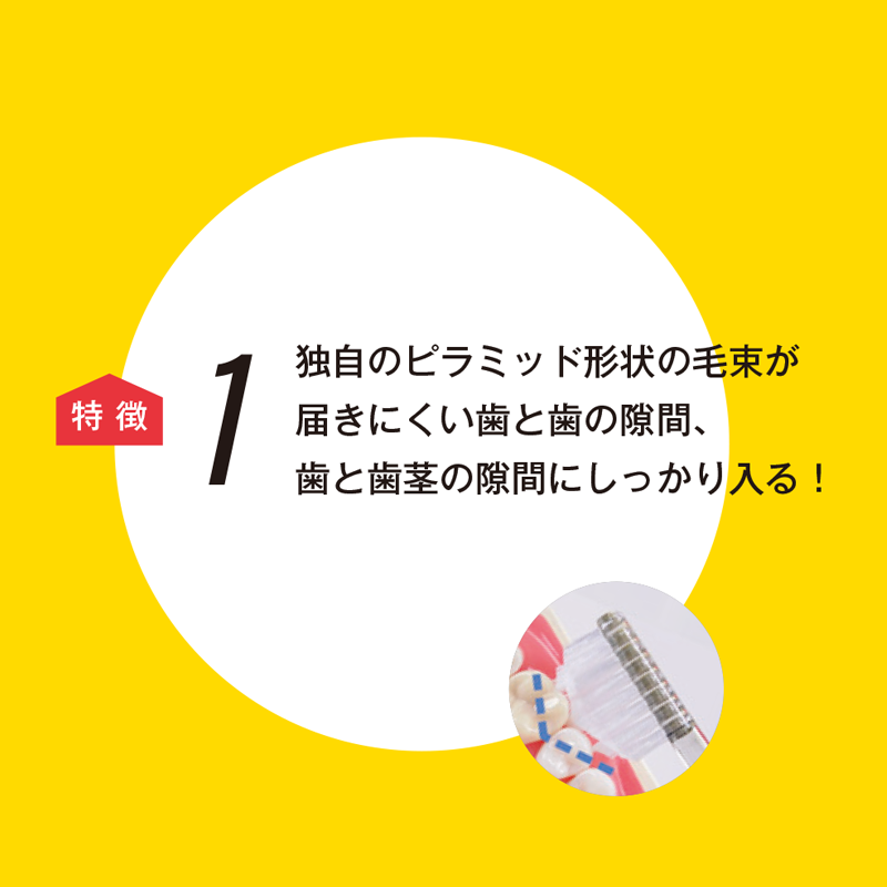 独自のピラミッド形状の毛束が、磨きにくい歯と歯の隙間や歯と歯ぐきの間にしっかり入り込みます。