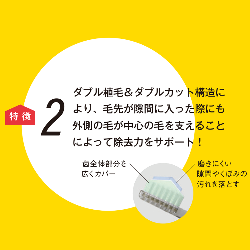 ダブル植毛&ダブルカット構造により、毛先が隙間に入った際も外側の毛が中心の毛をしっかりサポート。