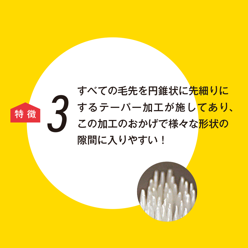すべての毛先に円錐状のテーパー加工を施し、さまざまな形状の隙間にもスムーズに入り込みます。